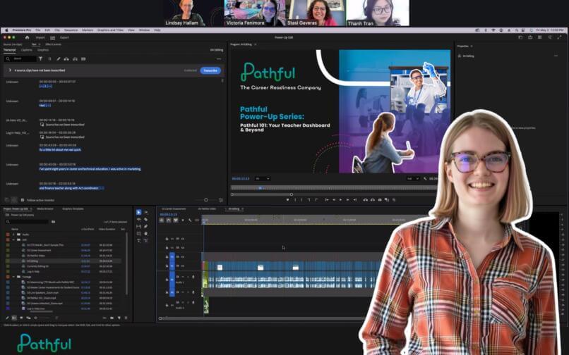 "Utilizábamos Adobe Premiere Pro y Adobe After Effects para editar los vídeos", explica. "Editábamos las reuniones con Zoom, y yo tenía los vídeos en carpetas gigantes que me descargaba. Luego aprendí a usar Premiere Pro para transcribir las reuniones y eliminar los espacios y cosas así".